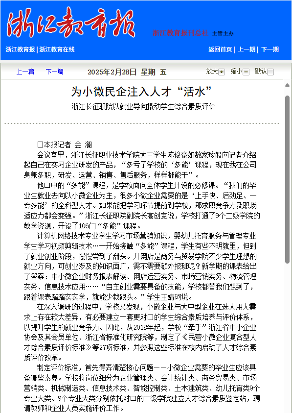2月28日,《浙江教育报》以“为小微民企注入人才‘活水’—浙江长征职院以就业导向撬动学生综合素质评价”为标题报道了我校人才评价改革取得的成效。