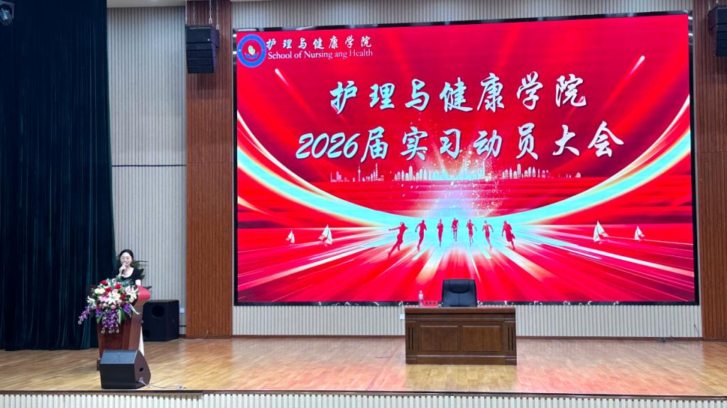 近日,护理与健康学院召开2026届实习动员大会。浙江省人民医院护理部副主任葛俐俐、护理与健康学院党政领导、全体教师、学生代表共500余人齐聚一堂,为即将踏上实习征程的学子明确目标、树立职业信念。会议由护理与健康学院副院长应佳盈主持。