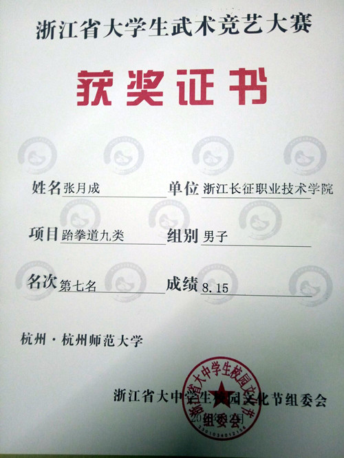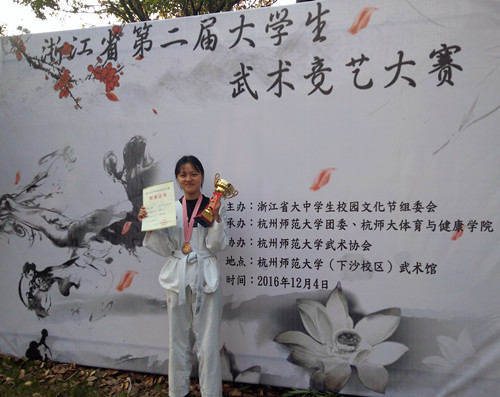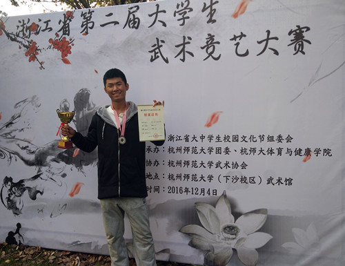 12月4日,由浙江省大中学生校园文化节组委会主办,杭州师范大学团委、杭州师范大学体育与健康学院承办的浙江省第二届大学生武术竞艺大赛在杭州师范大学举办。金华职院、浙理工大等20多所高校参加了本次比赛。我院参赛代表克服重重困难,取得佳绩。